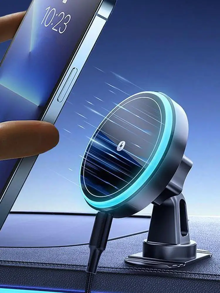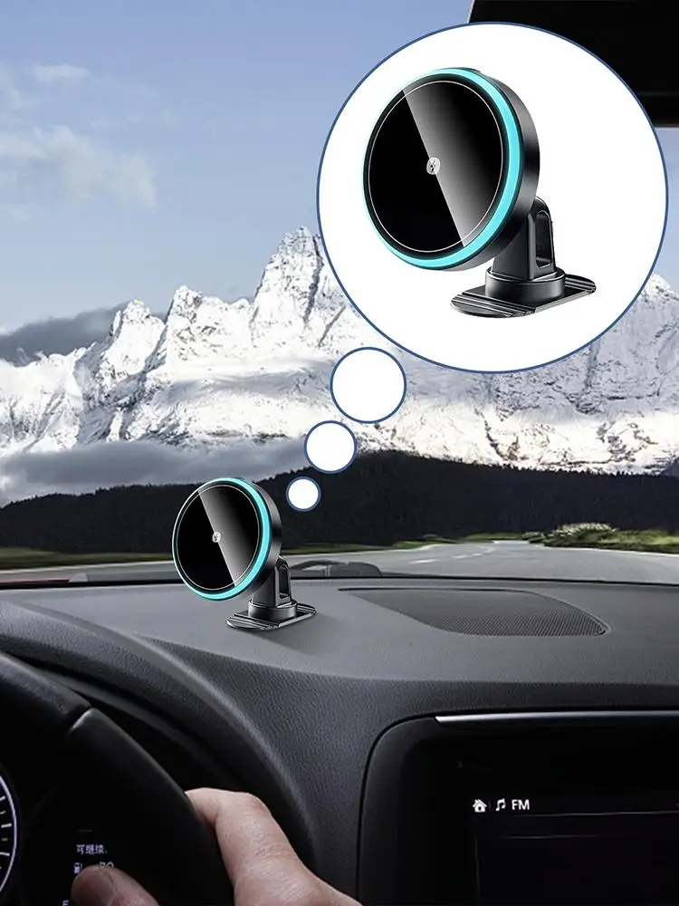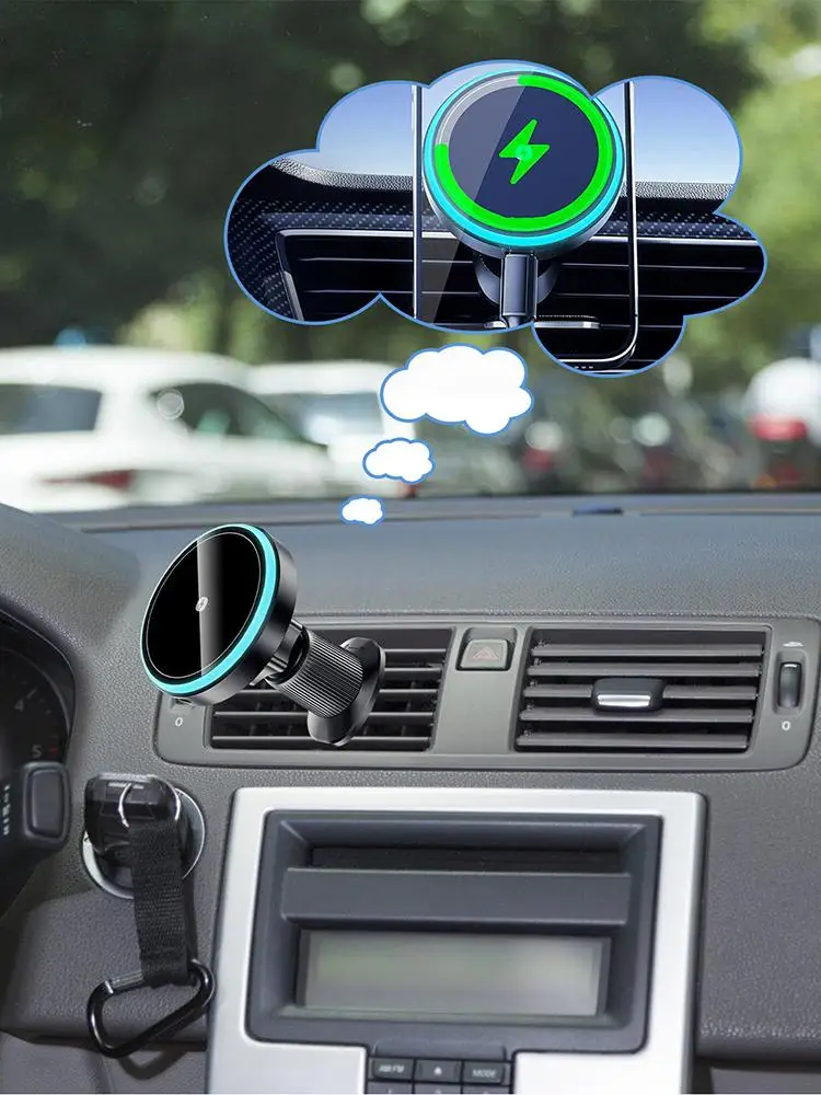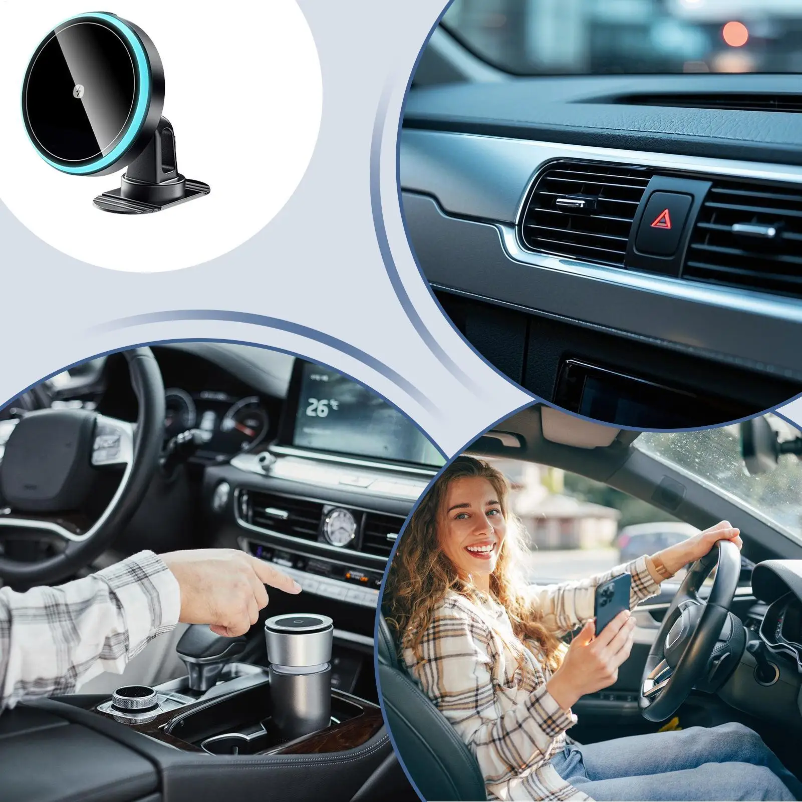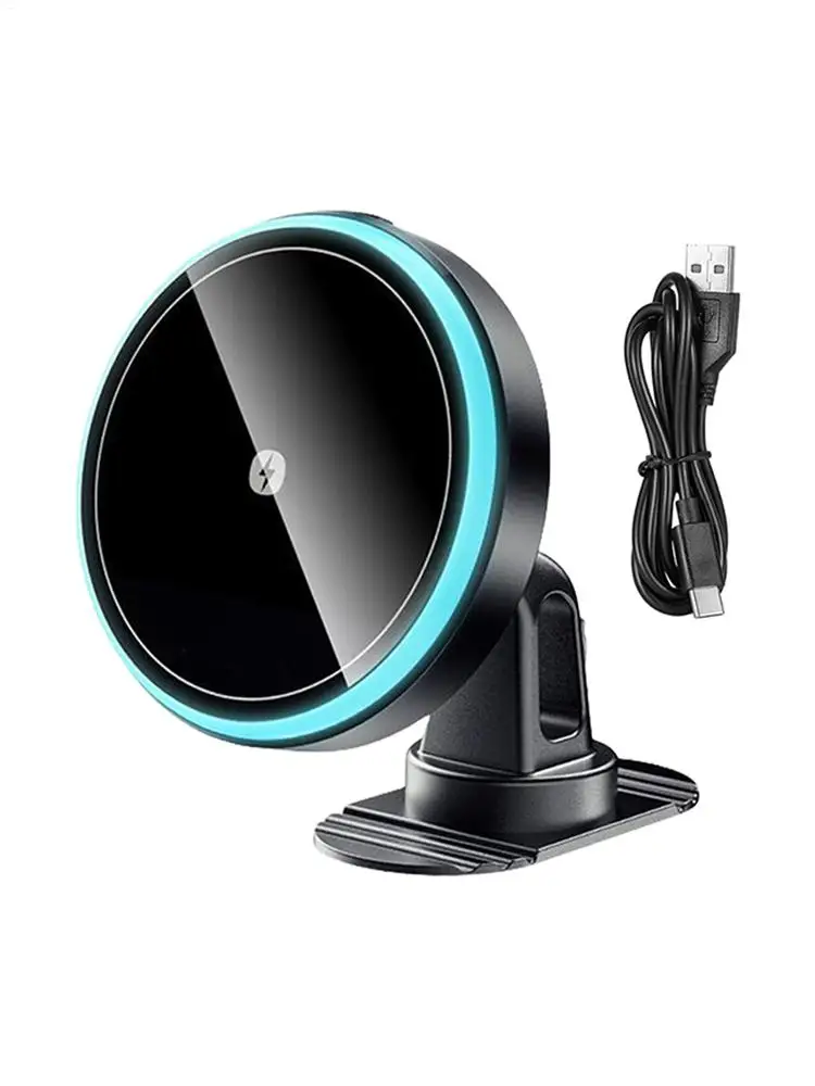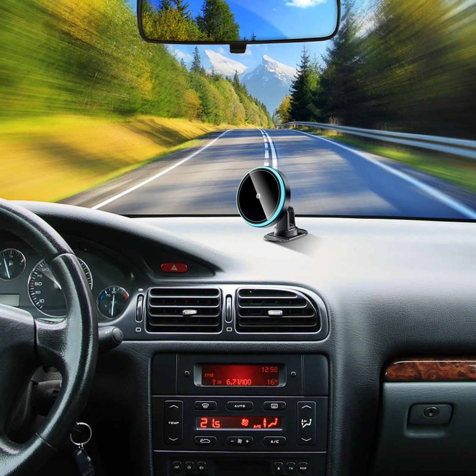 This magnetic wireless charger supports fast charging and is suitable for cars, trucks, RVs, and sedans. It features an adjustable angle for perfect positioning on the dashboard, center console, or air vent. Enhanced with safe charging technology and RGB light, it ensures convenience and visibility during travel, day or night. A practical choice for modern drivers.