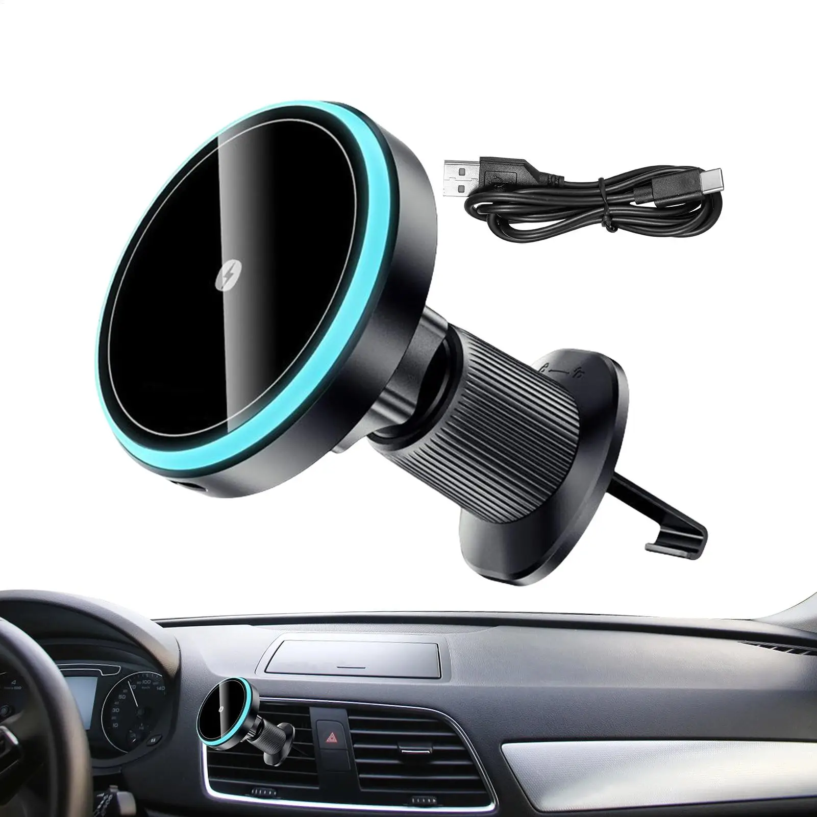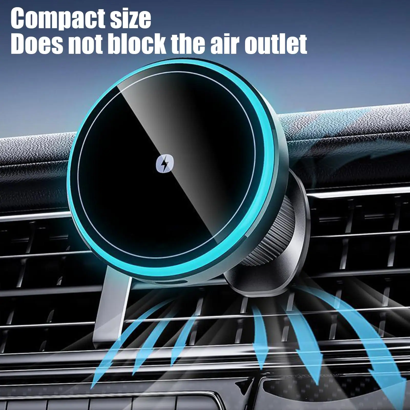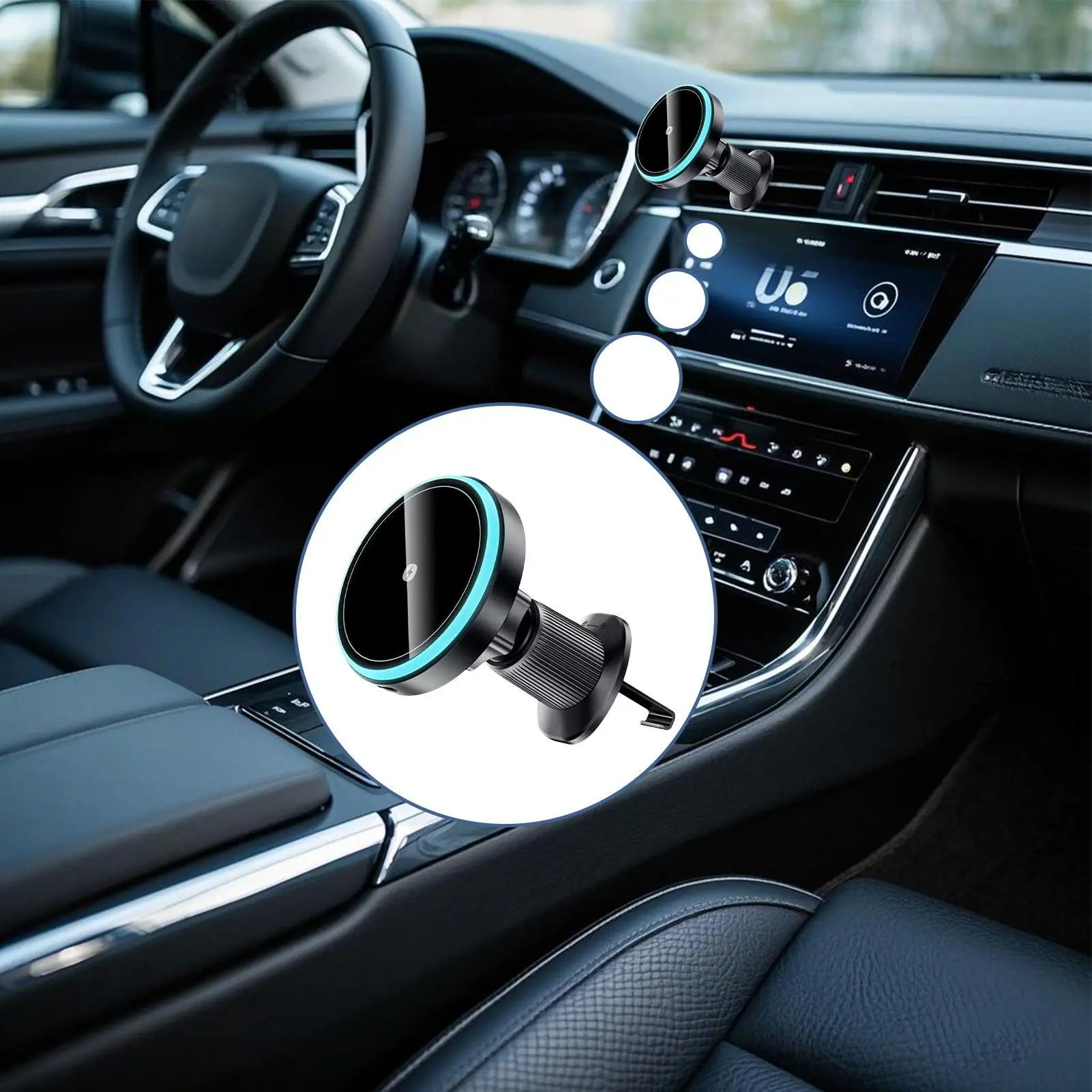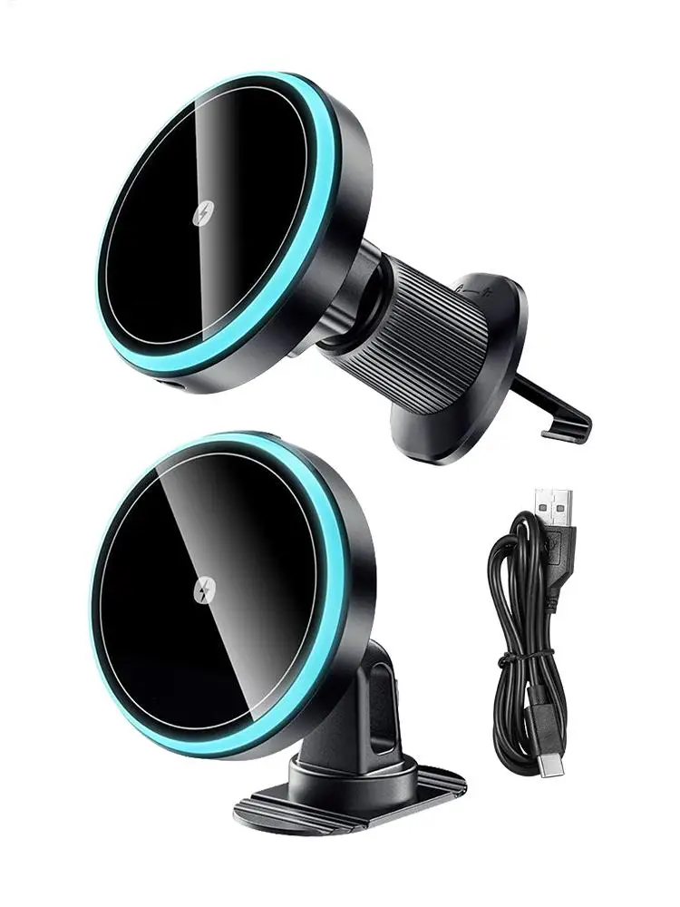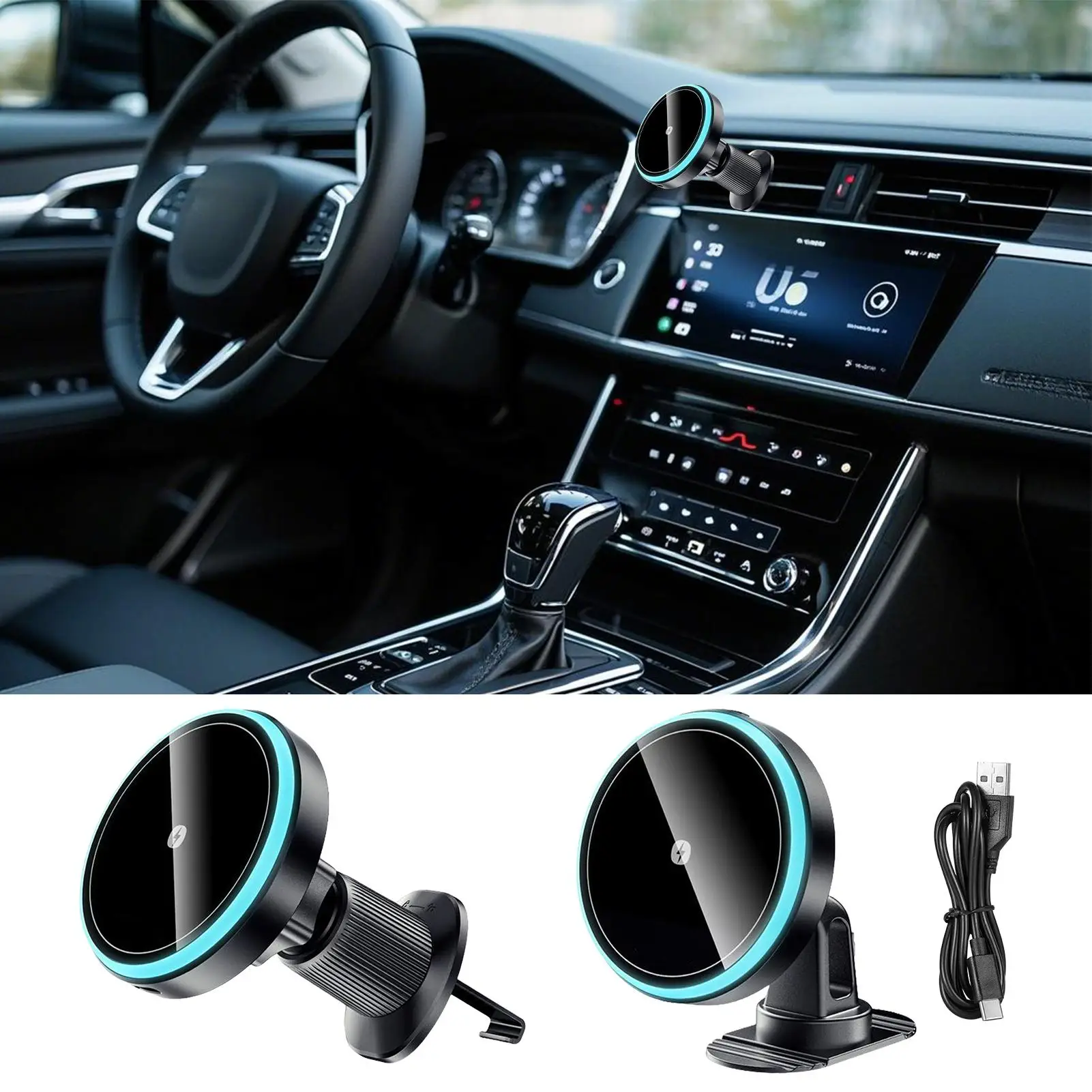 This magnetic wireless charger supports fast charging and is suitable for cars, trucks, RVs, and sedans. It features an adjustable angle for perfect positioning on the dashboard, center console, or air vent. Enhanced with safe charging technology and RGB light, it ensures convenience and visibility during travel, day or night. A practical choice for modern drivers.