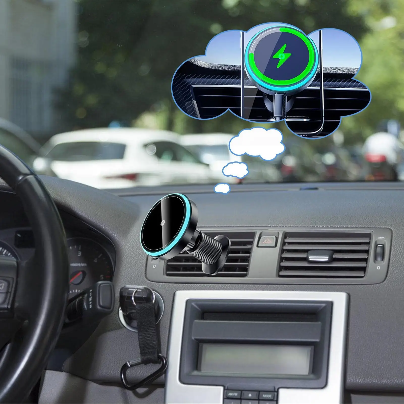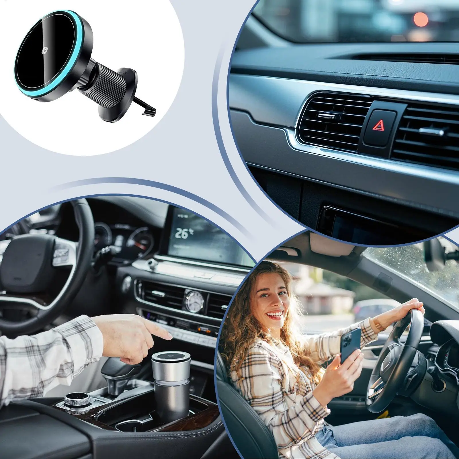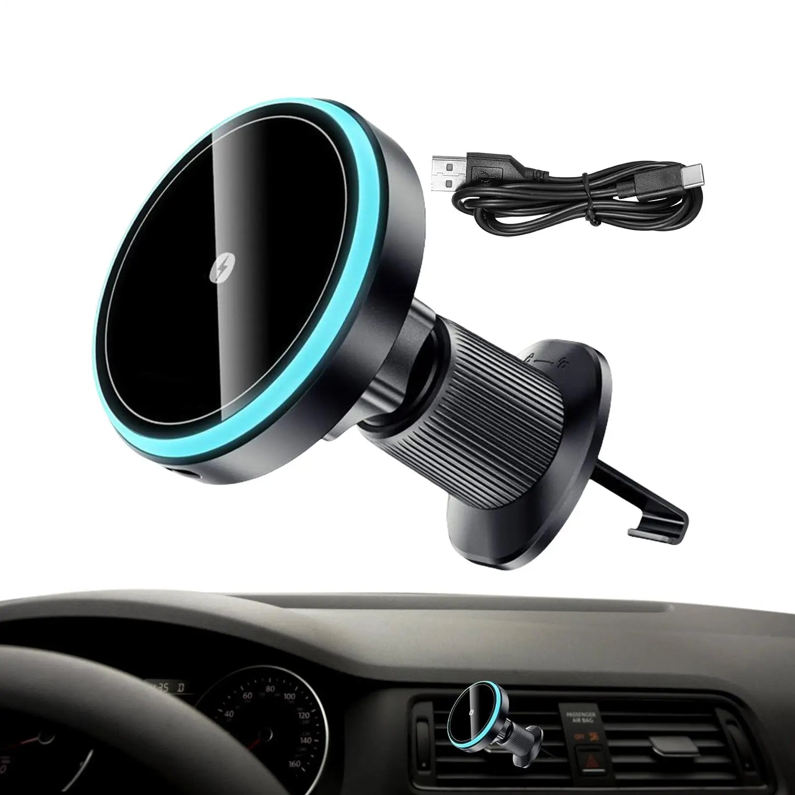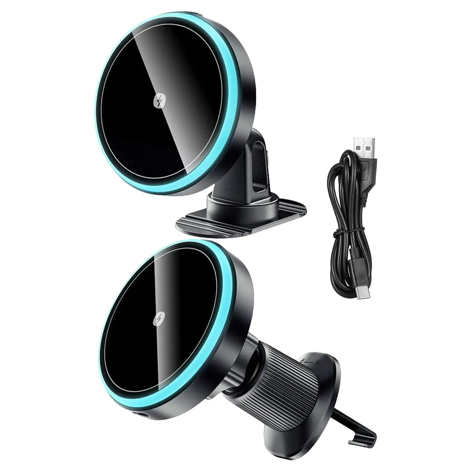 This magnetic wireless charger supports fast charging and is suitable for cars, trucks, RVs, and sedans. It features an adjustable angle for perfect positioning on the dashboard, center console, or air vent. Enhanced with safe charging technology and RGB light, it ensures convenience and visibility during travel, day or night. A practical choice for modern drivers.